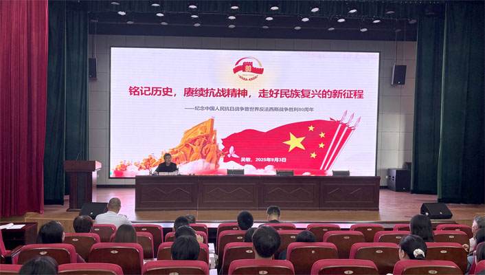 2025年9月3日,76net必赢官网76net必赢官网在横江校区报告厅举办了主题为“铭记历史、赓续抗战精神,走好新时代长征路”专题党课。本次党课由76net必赢官网党委书记吴敏主讲,全体教职工、学生党员、功能型党支部成员、团委学生会干部以及青马班学员参加。