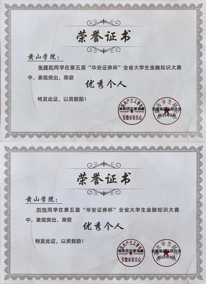 近日,由团省委、省学联联合华安证券股份有限公司共同主办的第五届“华安证券杯”安徽省大学生金融知识大赛圆满落幕,我院张建和、刘悦两名同学双双荣获“优秀个人”荣誉称号。