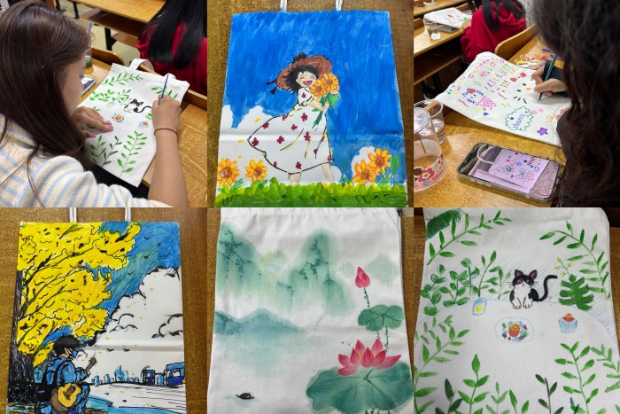 活动现场准备了空白帆布包、环保纸袋、丙烯颜料、专业画笔等创作工具,还组织志愿者提前一周在校园内采集银杏叶、枫叶等植物素材,通过压花、风干等工艺保留其纹理与色彩。活动过程中,参与同学纷纷发挥想象,在帆布袋上肆意挥洒创意,创作出了一系列优秀的作品。