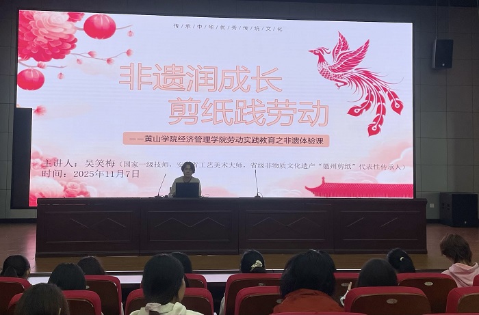 为传承中华优秀传统文化,深化劳动教育内涵,11月7日下午,76net必赢官网特邀省级非物质文化遗产“徽州剪纸”代表性传承人吴笑梅老师进校园开展“非遗润成长、剪纸践劳动”劳动实践教育之非遗剪纸体验课,本次活动作为学院劳动教育课程的重要实践环节,让同学们在指尖流转间感受非遗魅力,在动手实践中体悟劳动价值。