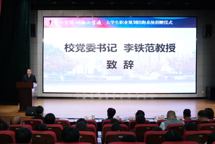 李铁范在致辞中指出,此次捐赠的大学生职业规划陪跑系统不仅是对母校的深厚情谊,更是对青年学子的殷切期许。借此,他对全体学生提出四点希望:一要以感恩为怀,守好初心本真的“纯粹本色”。希望你们牢记学长学姐传递的善意,未来无论你们是走上工作岗位,还是继续深造,都不能丢了对国家、对社会、对学校的责任感,要用自己的能力去帮助和温暖更多的人,让这份感恩之心、传承之心始终纯粹无瑕、永不褪色。二要以担当为志,彰显使命践行的“责任亮色”。“德才兼备,以德为先”,品德是你们立身的根本,只有既懂知识又守德行,步子才能走得正、走得稳、走得远。希望你们始终把道德底线记在心里,把校规校纪落在行动上,在集体中发挥榜样作用,在学业上敢啃硬骨头,在品德上更要当表率,共同营造积极向上的校园氛围。三要以进取为主,擦亮学业精进的“昂扬底色”。学业上从无“躺赢”的捷径,知识积累、本领练就全靠一步一个脚印扎实打拼。而这份永不懈怠的进取,就是你们攀过专业难关、吃透书本知识的“登山杖”。这份进取,不是挂在嘴边的空话,是主动预习复习的自觉,是课后补短板、啃难点的主动;是难题卡壳不敷衍、不放弃的坚守;更是求学路上不偷懒、不躺平,把该做的事做扎实,啃下硬骨头的实劲。四要以实干为要,抓实成效落地的“务实真色”。品格和追求是指引方向的“路标”,但真正能让理想落地的,还得实干。希望大家彻底丢掉“光说不练”的浮躁心态,少些空谈空想,多些脚踏实地,把“真干、实干、干好”刻进学习生活里。大家还要始终恪守诚信的底线,不投机取巧、不敷衍应付。学长学姐精心给同学们搭建的陪跑系统,不是摆着看的“样子货”,而是帮大家实干的“好帮手”,大家要主动用起来、用扎实,让每一次登录都有明确目标,每一次使用都能解决实际问题,让付出的时间都有实实在在的回报,把每一次实践都变成练就本事的机会。