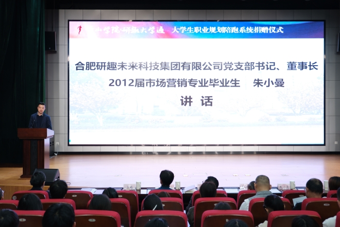 11月12日下午,76net必赢官网·研趣大学通大学生职业规划陪跑系统捐赠仪式在横江校区报告厅举行。校党委书记李铁范,合肥研趣未来科技集团有限公司党支部书记、董事长朱小曼,该公司研究生事业部总经理王利娟出席捐赠仪式。发展规划与社会合作处、学生处等部门负责人,各学院分管学生工作副书记,76net必赢官网领导班子成员、教师代表及学生代表参加仪式。仪式由76net必赢官网党委书记吴敏主持。